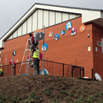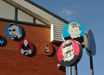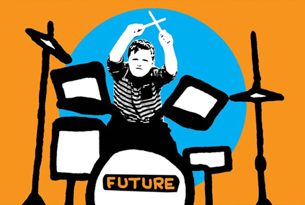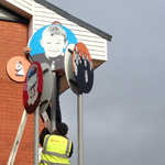 Commissioned by Lancashire County Council in conjunction with Burnley Young People's Service, with particular thanks to Paul Kelly (LCC), Debbie Taylor (LCC) and Neil McCormack (MB Signs, Accrington). A series of 'road sgns' with images developed by the young people and made graphic by Dunn are installed at the newly built Zone in the centre of Burnley. Every other agency in Burnley are invited to request their own ideas around future enterprise or activities, and to have their own sign produced and installed, as a mark of signing up to Burnley's future (two having already signed up prior to installation). We chose as the signature image, the young man vehemently drumming; the word FUTURE emblazoned across his kit. |