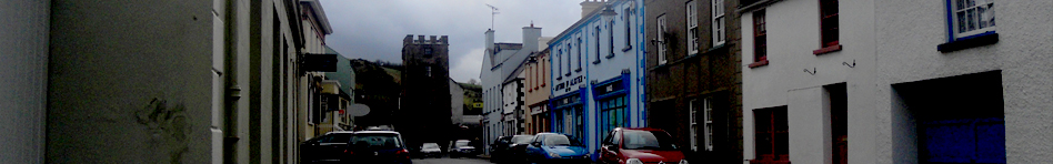 I wandered the beach, Micky's words ringing in my ears 'you're nearer Kintyre than Belfast' and my singing voice, rusty since duetting with Dougie on 'Trail of the Lonesome Pine' back in 1976, sings McCartney's 'Mull of Kintyre' into the blistering wind. The wind refused the words and blew them right back. I took a copy of my '44' CD 'Adventures in numb4rland', fresh from the pressing plant, and left one on the shelf, my homage to Drummond's '45'. My flu gets worse but I chat to the librarian - she looks extremely puzzled when I ask for any literature about the Tower - and the Tourist Information (she also finds it hard to believe I am interested in the Tower). She phones for the bus times out of Cushendall and I smile when I hear her saying '1.45'. I chat to the Senior Butcher who recommends Jimmy Joes, but with that not opening until 8pm, I have a chaser and a pint in the old man's Central Bar. I mean, really old men. I write and I write and I record the sound of a young man looking 'for the fucking restaurant' just outside the dungeon. I edit the sound and browse the shelves and art-free walls. The one-handed clock, the registration plate, the 'redrum' and hand-print on the bathroom wall, the 'take me home' red text on the top floor window, the closed hatch that leads to the Bell that was rung every night at 9pm, curfew time.