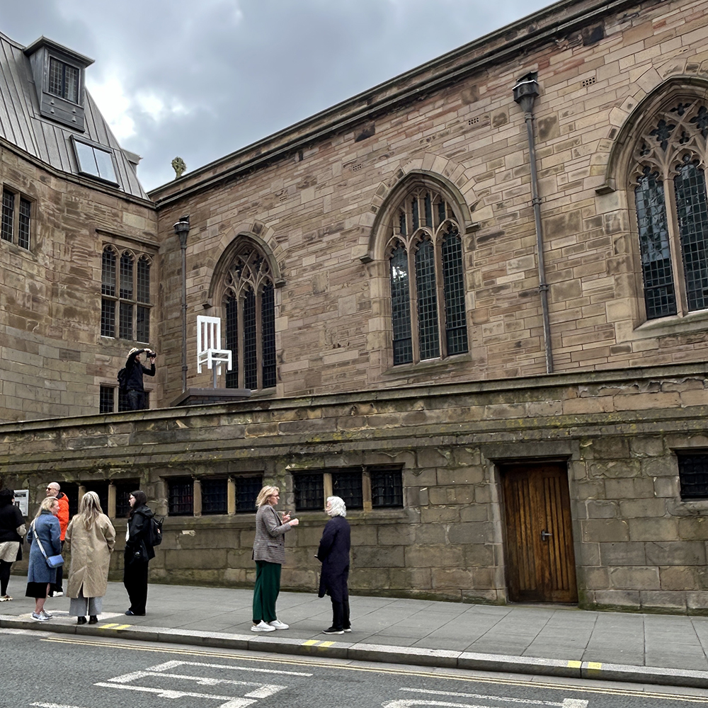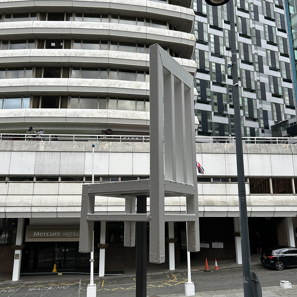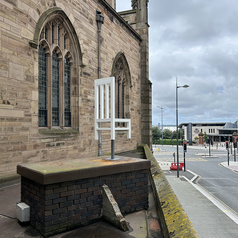 A spectral white chair, already vaguely familiar to the public, hovers above the plinth. An ambitious idea, ascension takes a component from an existing artwork in Liverpool and, by shifting its context, invites us to think about aftercare and those in our society less well off. Liverpool Biennial recently staged an event around the proposition “How do we consider and care for artists and audiences after the work is done – thinking about the work after the work.” This is the starting point for this work, which separates the decommissioned two-chair artwork RAY + JULIE (Alan Dunn & Brigitte Jurack, London Road, 1995-2023) and brings one chair to the plinth, coating it white and making it appear to float. Click here for full history of RAY + JULIE. Named after an innocuous piece of graffiti on the back wall and commissioned in 1995 by the Furniture Resource Centre to highlight the need for affordable furnishing, the original RAY + JULIE artwork existed for 27 years. Nobody ever knew who RAY + JULIE were, but in this new work they are separated, RAY at the plinth and JULIE left behind on London Road. It will be the first time in 27 years they will have been separated and will remind us of the solice and support that faith brings to the lonely and the forgotten. AD: "After we created RAY + JULIE, only intended to last for six months until the road was redeveloped, they were adopted by the people of Liverpool in such a beautiful manner. The two original chairs (chairs because one commissioner was the Furniture Resource Centre to help those in vulnerable housing) are very loosely modelled on a Charles Rennie Macintosh chair from Glasgow School of Art where the two artists first met and fell in love. The two original chairs were sinking and survived for 27 years before we requested that they were decommissioned, with a potential sale of the site. We could never find anywhere suitable to rehome RAY + JULIE but this makes sense now – give JULIE her quiet independence and allow RAY to float. Over their 27 years, the chairs became the subject of poems, short stories, photographs, a play at the Everyman Theatre, a spoken word installation in St Georges Hall and were once described by The Guardian as one of Britain's Top Ten Secret Sculptures. In creating this new work for Liverpool Parish Church, using RAY, we are also creating another work, JULIE (on her own) on London Road." Liverpool Sculpture Prize is supported by Liverpool Bid Company and Liverpool Parish Church (Our Lady and Saint Nicholas). |