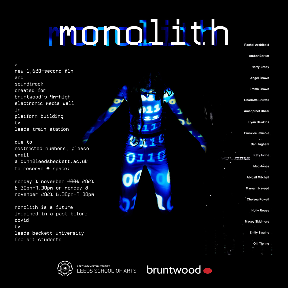 | monolith Leeds Beckett University - BA Fine Art L6 students (created pre-Covid when in L4), with Alan Dunn, November 2021. Digital video animation and soundtrack, 27 mins. What did the future really look like to those students at Leeds Beckett University back in 2019? Taking inspiration from Stanley Kubrick’s ‘2001: A Space Odyssey’ (1968), this new work offers insights into the futures of technology, gender and social media. Presented on Bruntwood’s ‘Monolith’-shaped Media Wall in Platform Building, the 20-minute looped film is set in a recognisable future in which artificial intelligence abounds, water is in short supply, connectivity is dangerous, currencies are highly complex, and cloning, codes and propaganda are rife. Accompanying the public screening will be an ambient soundtrack specifically composed by members of the production team.